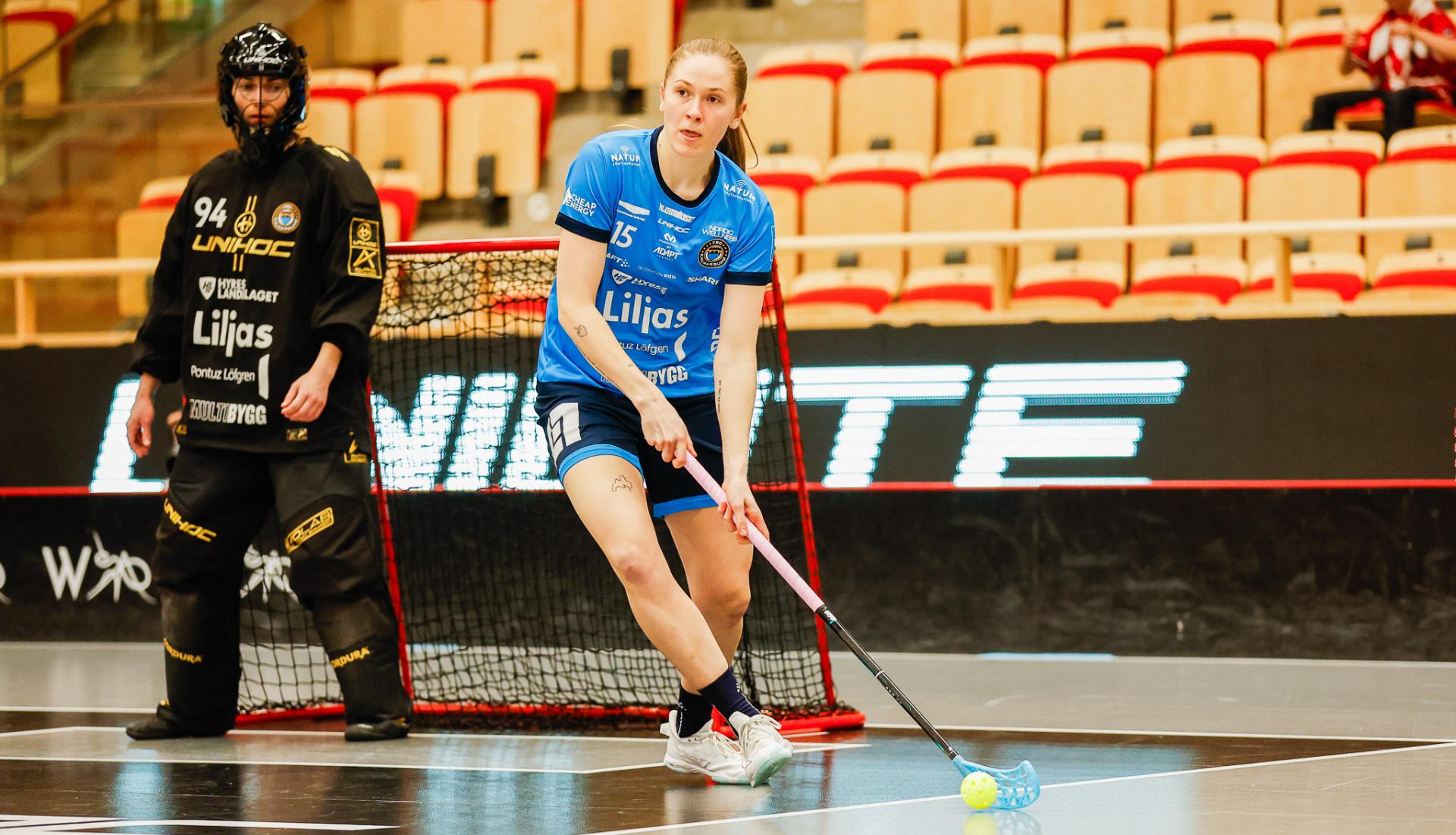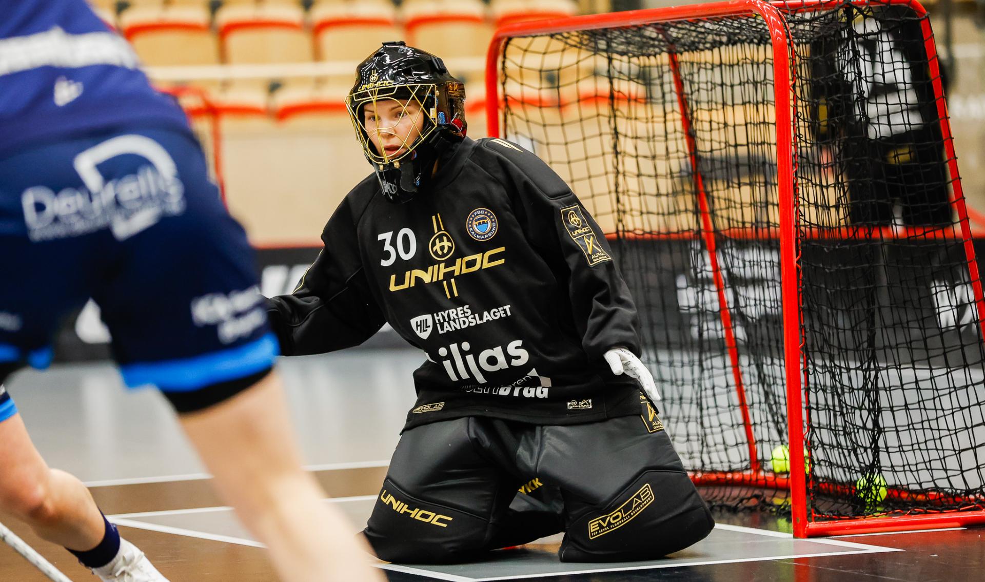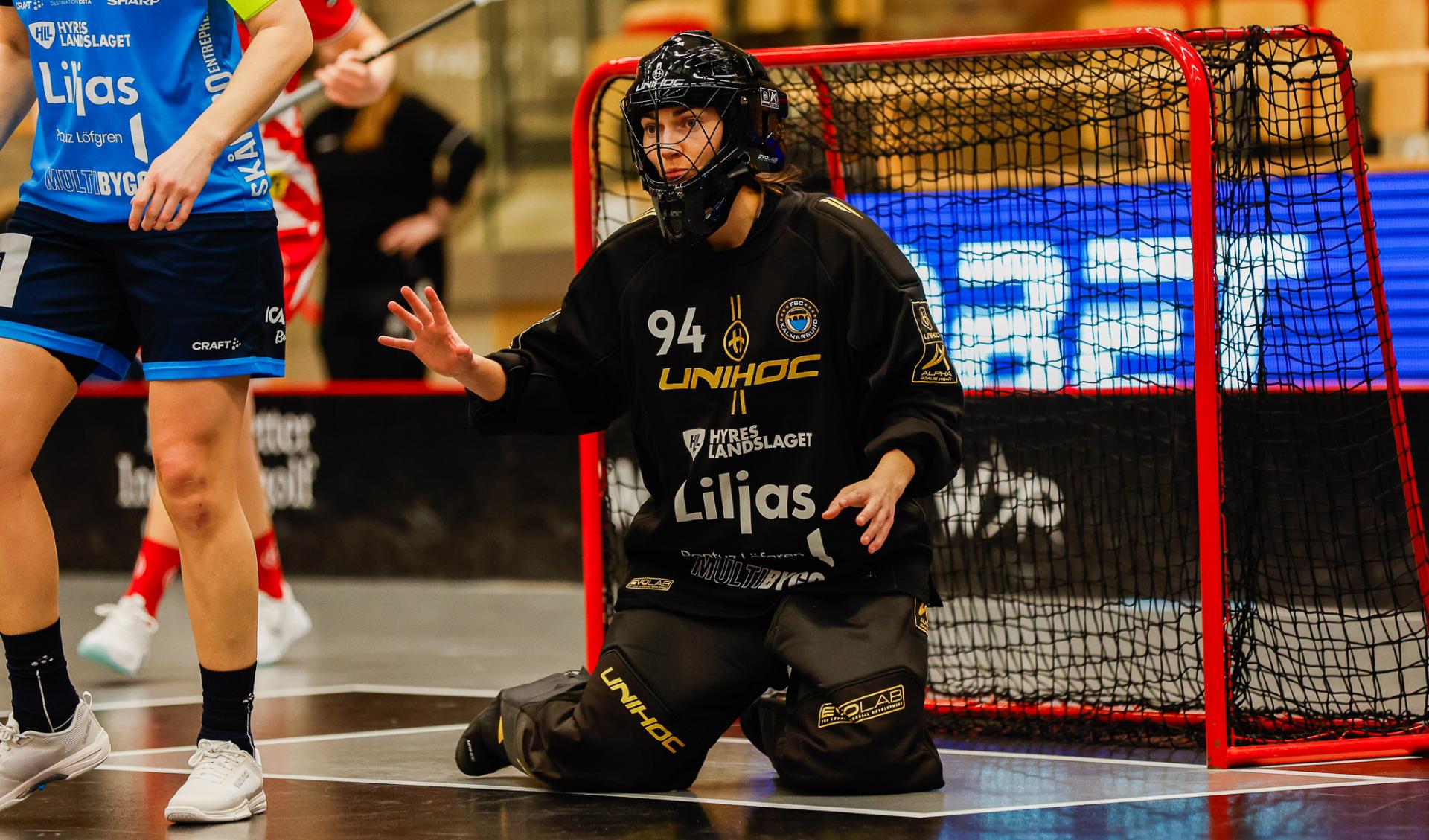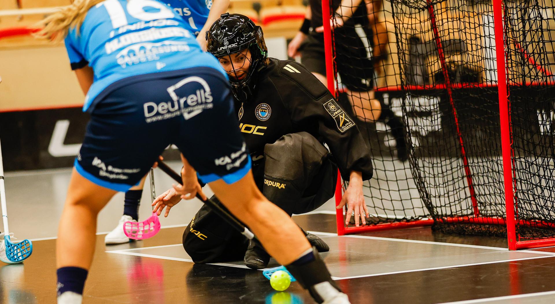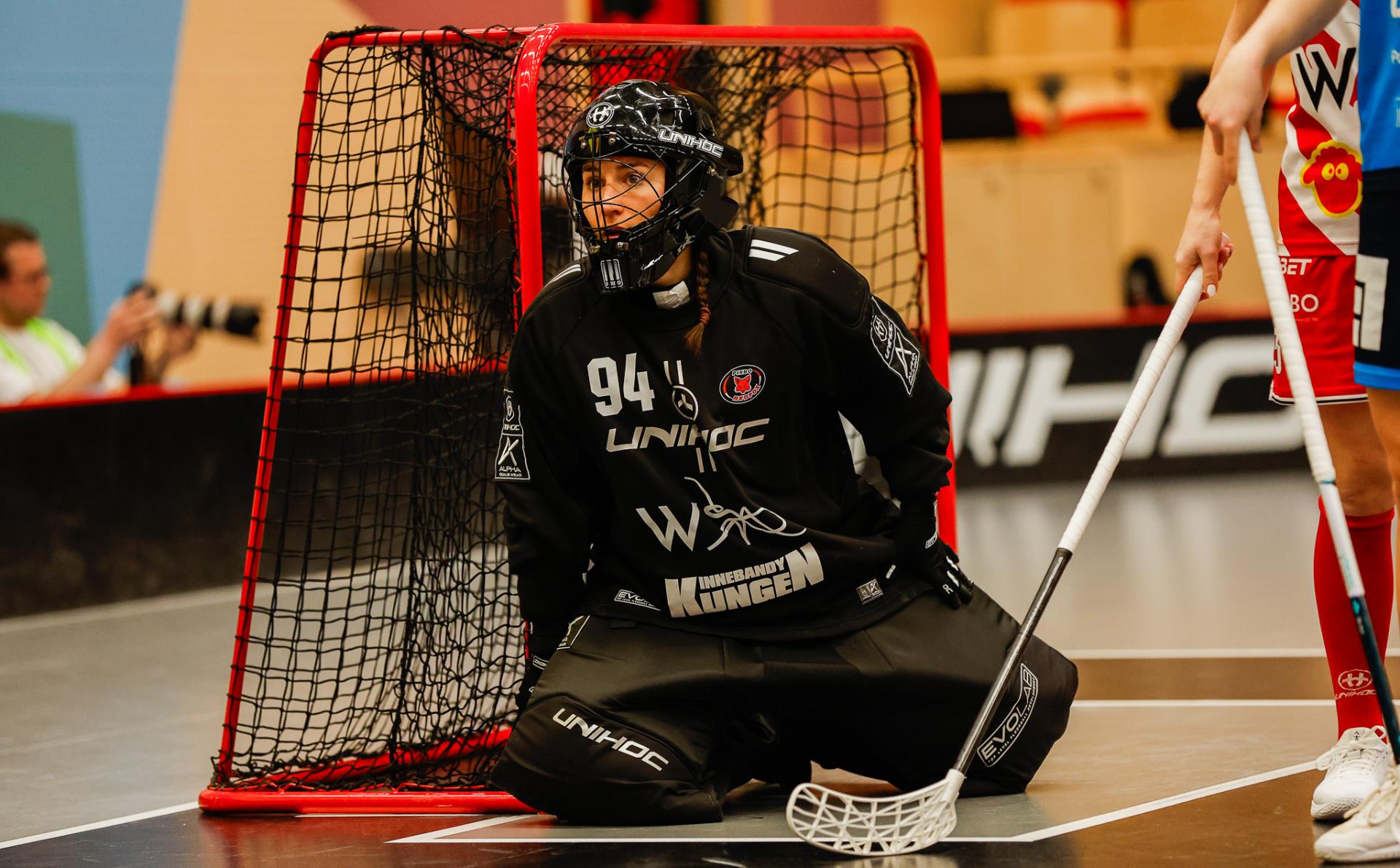Det er en forrykende start på kampen av Kalmarsund mot Pixbo, og allerede etter fire minutter ligger den første ballen bak Lara Heini. På andre siden av banen har Thea Ekholt det ganske rolig i starten, men varter opp med noen gode redninger. Dominica Buczek dobler gjestenes ledelse i det syvende minutt med en frekk zorro, og det får fart på hjemmelaget, men uten at de klarer å overliste den norske keeperstjernen. Det er en herlig innebandykamp, der begge lag gir alt i duellene, men det er Kalmarsund som er best i den første perioden som de vinner.