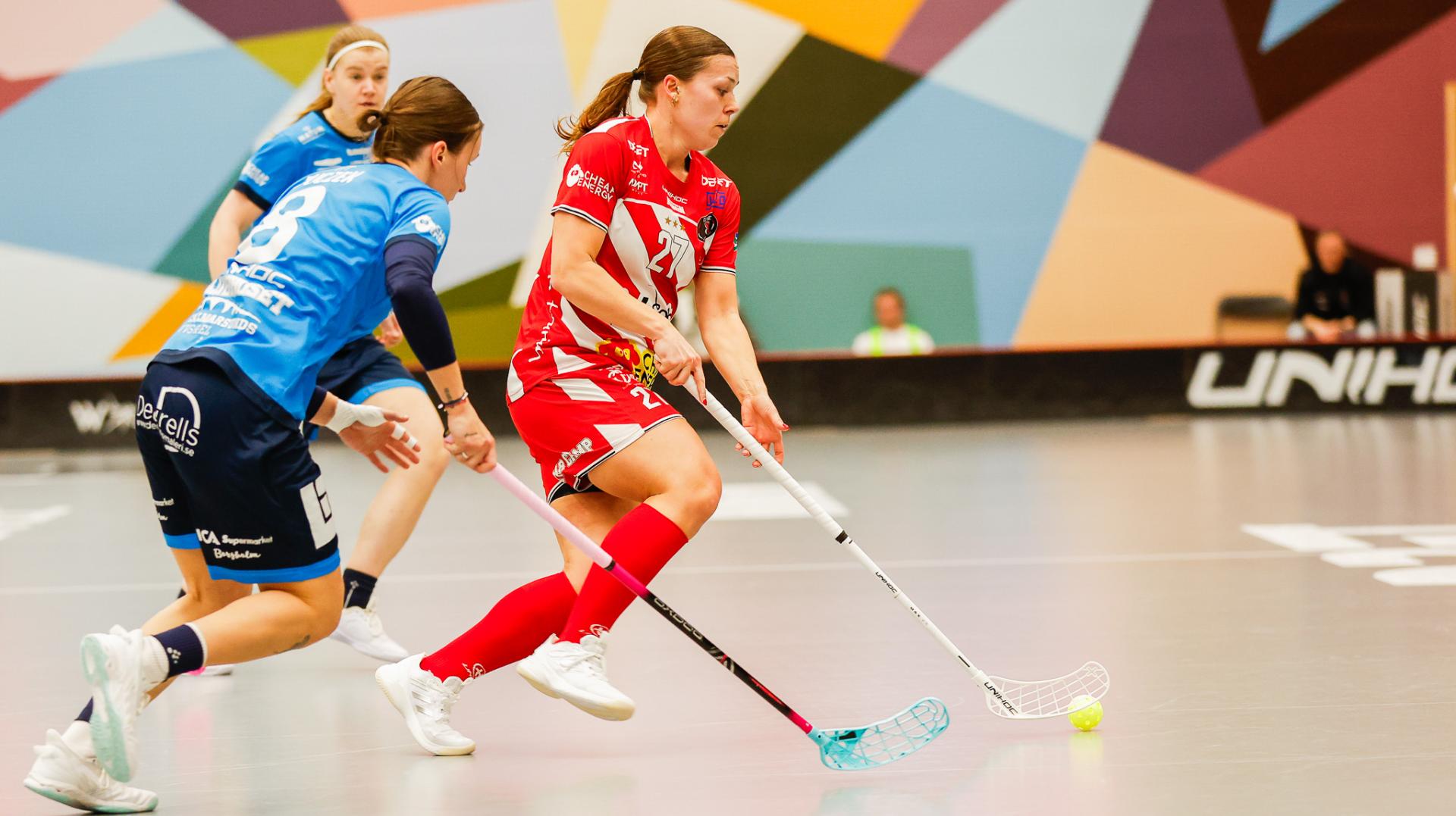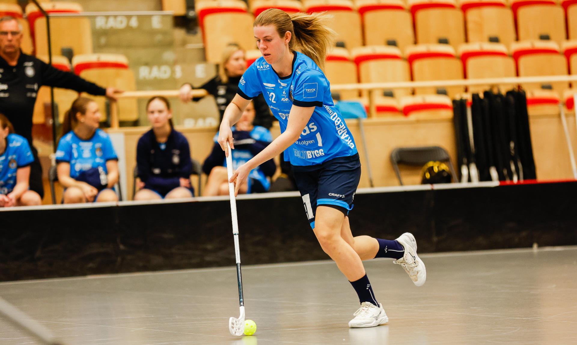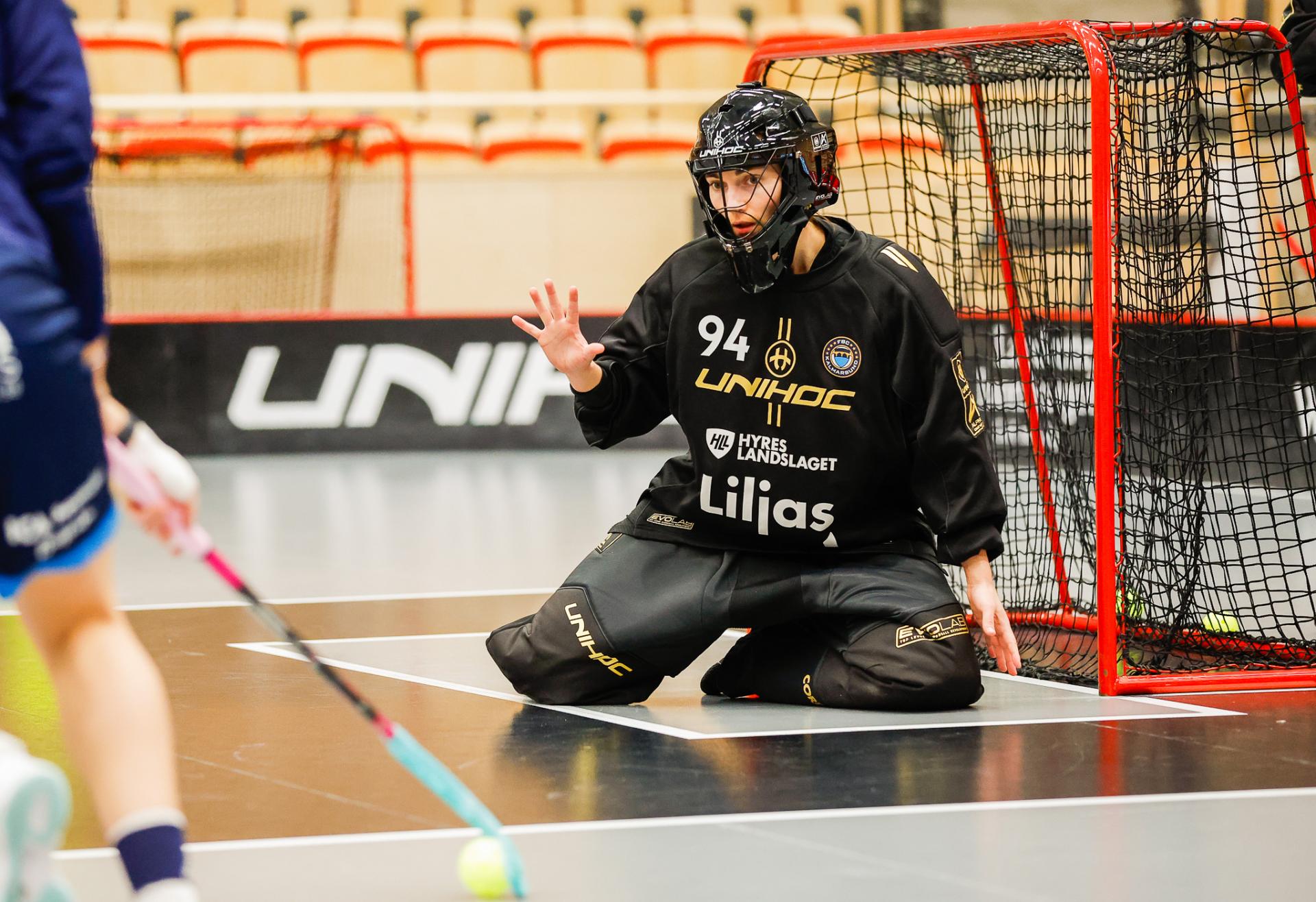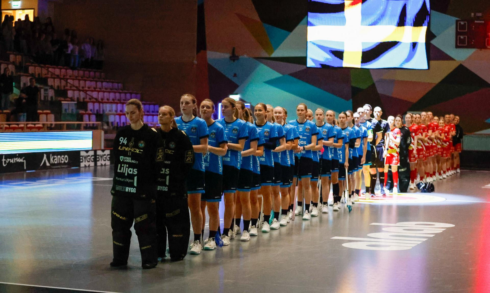 Det er en forrykende start på kampen av Kalmarsund mot Pixbo, og allerede etter fire minutter ligger den første ballen bak Lara Heini. På andre siden av banen har Thea Ekholt det ganske rolig i starten, men varter opp med noen gode redninger. Dominica Buczek dobler gjestenes ledelse i det syvende minutt med en frekk zorro, og det får fart på hjemmelaget, men uten at de klarer å overliste den norske keeperstjernen. Det er en herlig innebandykamp, der begge lag gir alt i duellene, men det er Kalmarsund som er best i den første perioden som de vinner.