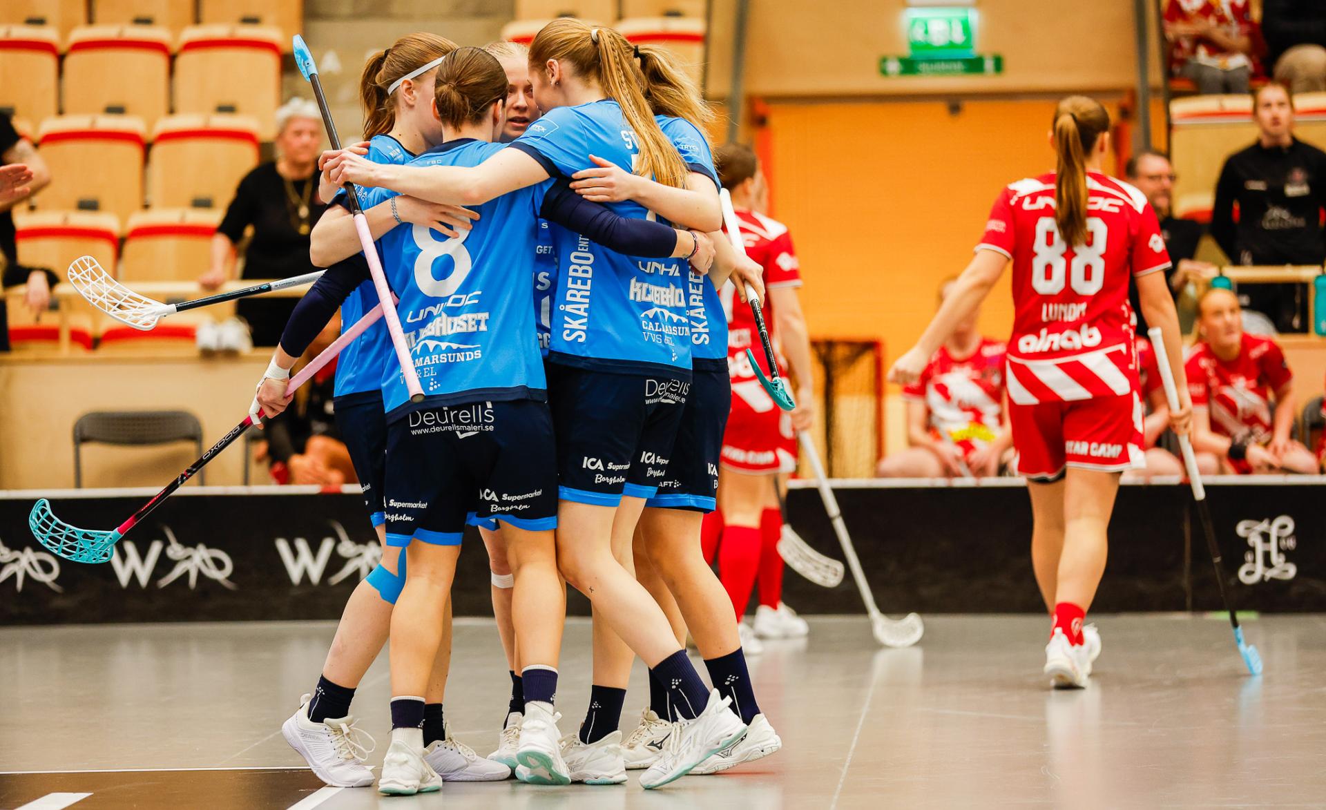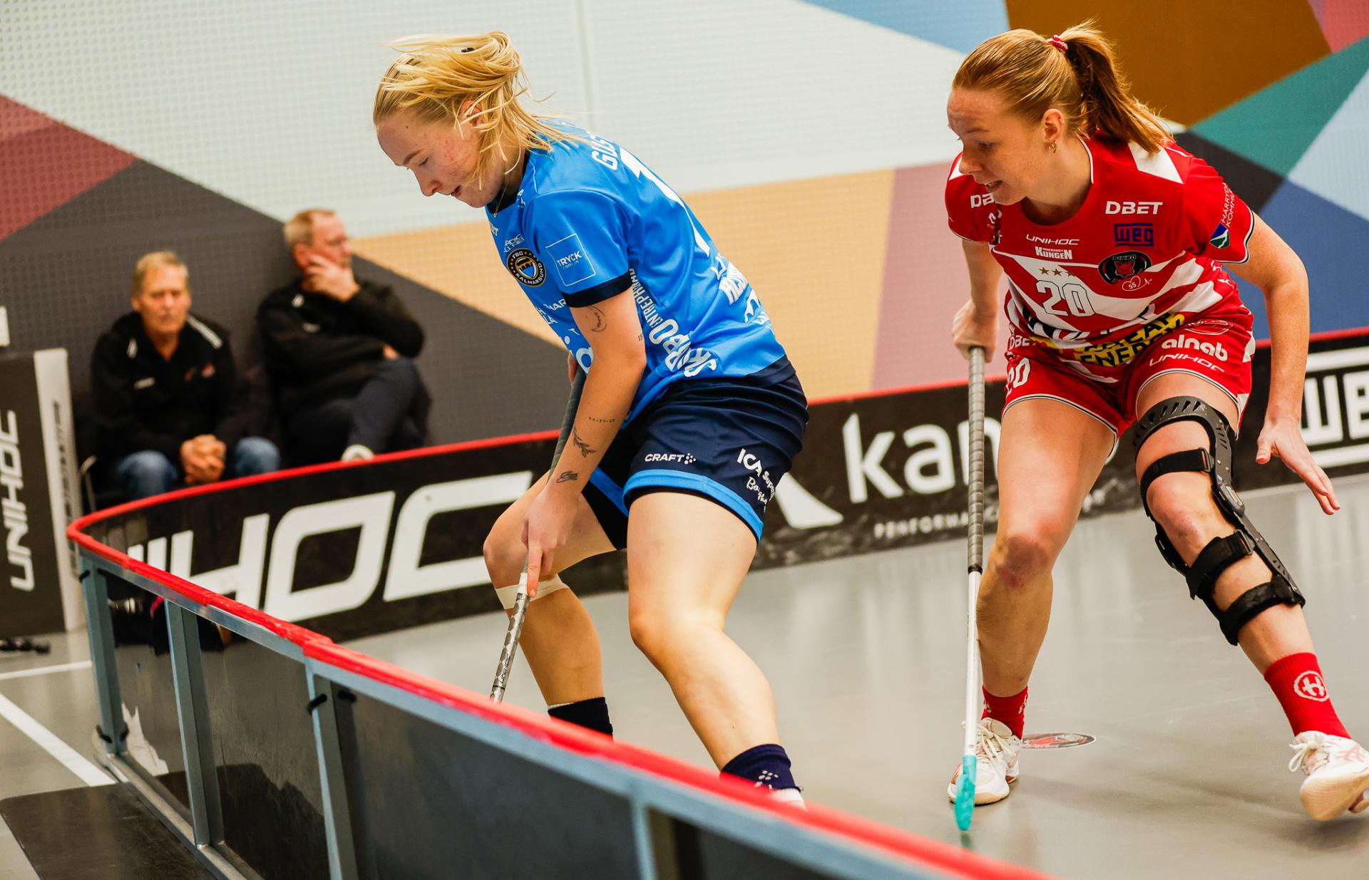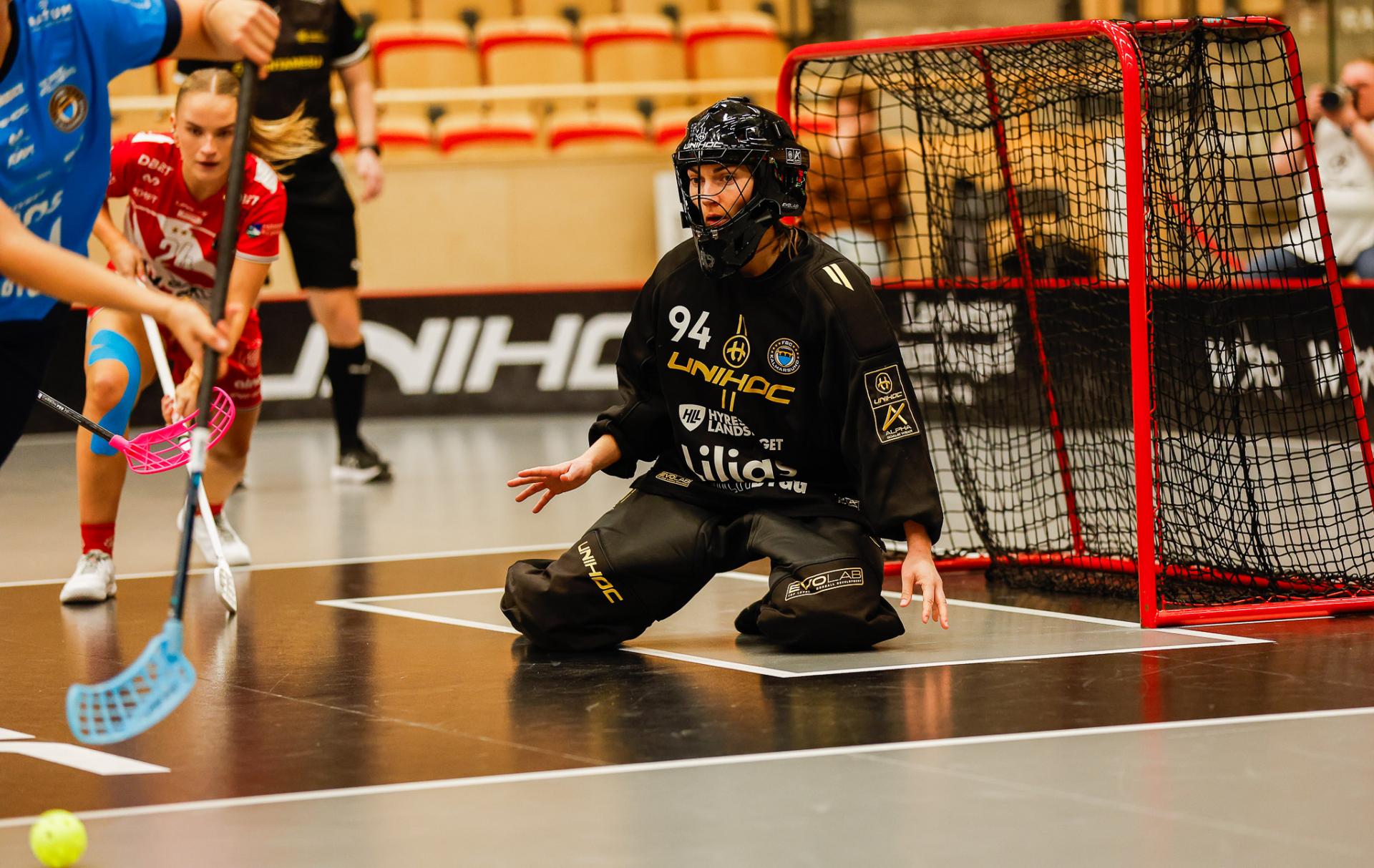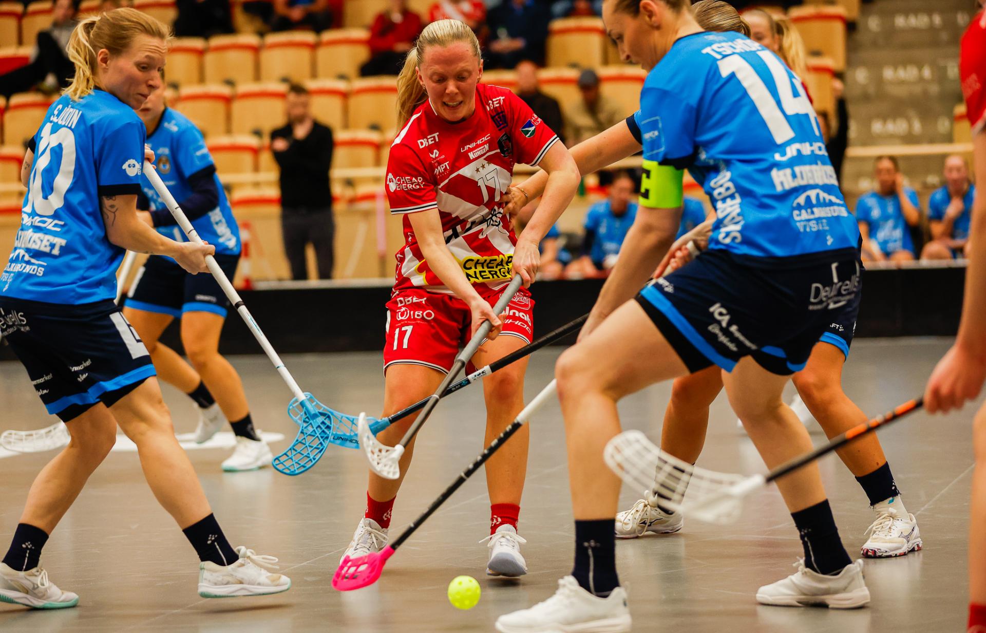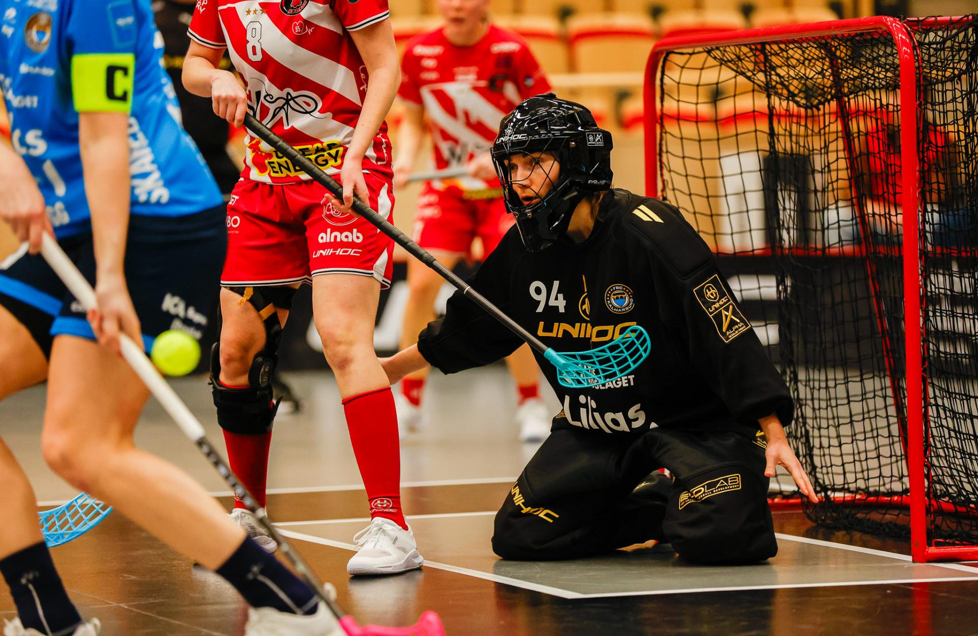 Det er en forrykende start på kampen av Kalmarsund mot Pixbo, og allerede etter fire minutter ligger den første ballen bak Lara Heini. På andre siden av banen har Thea Ekholt det ganske rolig i starten, men varter opp med noen gode redninger. Dominica Buczek dobler gjestenes ledelse i det syvende minutt med en frekk zorro, og det får fart på hjemmelaget, men uten at de klarer å overliste den norske keeperstjernen. Det er en herlig innebandykamp, der begge lag gir alt i duellene, men det er Kalmarsund som er best i den første perioden som de vinner.